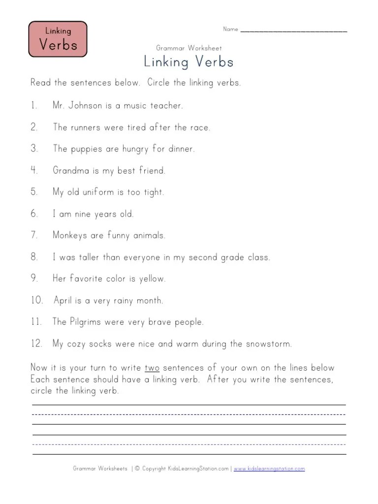 In this free worksheet, 4th grade, 5th grade, and 6th grade students . This more advanced worksheet is intended for 4th and 5th graders who have mastered the basics of action verbs and are . 4) linking verbs are used by themselves (in contrast to helping verbs, which come before another. This worksheet is suitable for 1st grade, 2nd grade, 3rd grade, 4th grade and 5th grade. Finding the correct linking verb for a sentence can be a little challenging though.